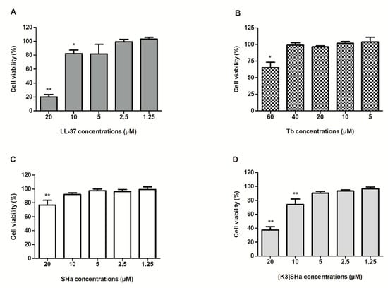 We evaluated the cytotoxicity of the anti-microbial peptides to human primary keratinocytes (Figure 1). The cell cultures were incubated in the presence of increasing concentrations of peptides to measure cell viability after 24 h of exposure. LL-37 showed little or no significant impact on cell viability at concentrations of 1.25 and 2.5 μM but, at 5 µM, viability decreased to 80%. Based on previously published data, Tb was tested at concentrations ranging from 5 (7 µg/mL) to 60 µM (84 µg/mL) [21]. Significant cytotoxicity was only observed at the highest concentration used (60 μM) with a cell viability of 65%. Temporin-SHa was cytotoxic at 20 μM, showing a 77% cell viability, while [K3]SHa significantly decreased cell viability from 10 μM (74% cell viability) compared to untreated cells. The concentrations maintaining a cell viability greater than, or equal to, 90% were, therefore, used to test the anti-viral activity of the peptides. This ensured biasing of the results, that were obtained in viral replication, was minimized due to the significant cell mortality.