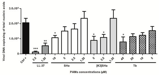 Replication of the virus was assessed by assaying viral DNA levels in cells treated with the peptides. Human primary keratinocytes were inoculated for 24 h with 0.1 MOI of HSV-1, without (positive control) or with previously-determined, non-cytotoxic increasing concentrations of the AMPs used in the above experiment (Figure 1). The viral DNA concentration was subsequently measured in the cell monolayer by qPCR to assess the effect of the peptides on HSV-1 replication (Figure 2). The results showed that the viral DNA measured in the untreated cells reached 2.1 × 105 copies per ng of total extracted nucleic acids at 24 h post-infection. The concentration of viral DNA was significantly reduced in cells treated with the two LL-37 concentrations of 1.25 and 2.5 µM causing a decrease of about one log (5.3 × 104 (75% reduction) and 1.2 × 104 copies (94%), respectively). Whereas, the other peptides were not as effective. SHa inhibited viral replication two-fold (52%) at the highest concentration tested, corresponding to 10 μM (1.0 × 105 copies in treated cells). [K3]SHa significantly reduced the viral DNA concentration compared with non-treated cells from 2.5 µM. Viral DNA concentrations measured were 1.1 and 0.9 × 105 copies at 2.5, and 5 µM, respectively, demonstrating a two-fold reduction (48% and 57%) that is equivalent to that obtained with SHa. Tb inhibited viral replication at 5 μM, but a significant reduction of HSV-1 replication was only observed at 40 μM, with a viral DNA concentration per ng of total cell nucleic acids equal to 0.8 × 105 copies or equivalent to a reduction of less than 3 times (62%) compared with untreated cells. For all peptides tested, the observed pattern suggested a dose-dependent inhibition of viral replication.