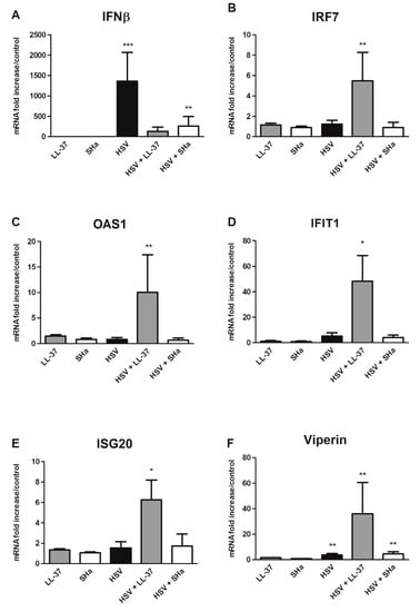To initially explore the mechanism of anti-viral activity assessed during keratinocyte infection, we chose to study the effect of 2 out of the 4 peptides in the cell innate immune response: LL-37, already known for its immunomodulatory properties, and SHa, which has not previously been reported to have an impact on the innate response [14,17,18,19,27]. The expression profile of cellular anti-viral responses in the presence, and in the absence, of LL-37 and Sha, was studied by transcriptomic analyses carried out on the same samples as those used to measure inhibition of HSV-1 replication in keratinocytes treated with AMPs. In addition, the pro-inflammatory properties of LL-37 and SHa were evaluated by incubating keratinocytes with peptides alone. The mRNA expression levels of interferon (IFN) β, as well as five interferon stimulated genes (ISG) (IRF7, IFIT1, OAS1, ISG20 and viperin), which are known for their anti-viral activities, were quantified in cells inoculated with peptides or virus alone, as well as with virus in the presence of the strongest non-cytotoxic concentrations of LL-37 (2.5 µM) and SHa (10 µM) (Figure 3) [28,29,30,31]. In keratinocytes infected with the virus alone, we observed a strong induction of IFNβ expression with a 1360 mRNA fold increase in comparison with uninfected keratinocytes at 24 h post-infection (Figure 3A). The induction of ISG expression was much lower ranging from 1.2 for IRF7 (Figure 3B) to 4.5-fold increase for IFIT1 (Figure 3D). In cells infected with HSV-1 in the presence of LL-37, the mRNA levels of all the ISGs tested were increased despite a lower viral replication. A significant induction of ISG expression by comparison with both, uninfected cells and cells inoculated with the virus or the peptide alone, ranging from 6 fold for ISG20 (Figure 3E) to 36 fold for viperin (Figure 3F), was assessed. The expression of IRF7, a multi-functional transcription factor that can activate ISG expression, was significantly induced by LL-37 in infected keratinocytes (Figure 3B), a phenomenon which was not observed for IRF1 and IRF3 expression [32]. However, the IFNβ mRNA level was increased at a lower level than in infected, but untreated cells (Figure 3A). No induction of IFNα, another type I IFN, and type III IFN (IFN-λ1 and IFN-λ2) expression was observed in infected cells in the presence or absence of LL-37.