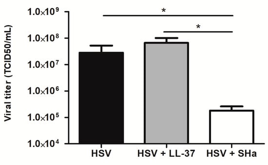 Evaluation of virucidal properties of LL-37 and SHa on HSV-1. HSV-1 suspension was pre-incubated in absence or presence of LL-37 (2.5 µM) and SHa (10 µM) for 1 h at 37 °C before titration by end-point dilution assay on Vero cells. Viral titers are expressed in TCID50/mL. Data are represented as mean + SEM of three independent experiments. *p < 0.05.