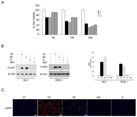 12-O-tetradecanoylphorbol 13-acetate (TPA) in combination with sodium butyrate (TB) and bortezomib (BZ) induce the Kaposi sarcoma-associated herpesvirus (KSHV) lytic cycle, while metformin and quercetin fail to do so in PEL cells. (A) The BC3 cell line was treated with either TPA (T) (20 ng/mL) and sodium butyrate (0.3 mM) in combination (TB), bortezomib (BZ) (20 nM), metformin (MET) (20 mM), or quercetin (Q) (15 µM). Cell viability was evaluated by trypan blue exclusion in a time course assay. Histograms represent the mean ± standard deviation (SD) of at least three independent experiments. (B) BC3 and BCBL1 cell lines were treated with TPA (T) (20 ng/mL) and sodium butyrate (B) (0.3 mM) in combination (TB), bortezomib (BZ) (20 nM), metformin (MET) (20 mM), or quercetin (Q) (15 µM) for 24 h. K-bZIP and β-Actin expression was evaluated by western blotting. Densitometric analysis was performed using Image J software and the ratio of K-bZIP versus β-Actin was calculated. Histograms represent the mean ± standard deviation (SD) of at least three independent experiments. (C) The BC3 cell line was treated with TPA (T) (20 ng/mL) and sodium butyrate (B) (0.3 mM) in combination (TB), bortezomib (BZ) (20 nM), metformin (MET) (20 mM), or quercetin (Q) (15 µM) for 24 h, and was analyzed by IFA for the expression of the late lytic antigen gp64. The percentage of gp64-positive cells is also indicated. Magnification 20×.