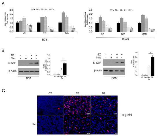 Oxygen reactive species (ROS) levels increase with TB- and BZ-treated PEL cells, and decrease in MET- and Q-treated PEL cells. (A) KSHV-infected BC3 or uninfected BJAB cell lines were cultured with TB (20 ng/mL and 0.3 mM), BZ (20 nM), MET (5 mM) or Q (15 µM) (6, 12 and 24 h) and ROS production was assessed by FACS analysis in a time-dependent manner using DCFDA detection assay. Histograms represent the fold increase of treated versus untreated cells. Standard deviations (SD) are shown. (B) KSHV lytic antigen K-bZIP expression in TB- (20 ng/mL and 0.3 mM) or BZ- (20 nM) treated cells, in the presence or in the absence of N-Acetyl cysteine (Nac) (5 mM), assessed by western blotting analysis. β-Actin was used as a loading control. Densitometric analysis has been performed using Image J software and the ratio of K-bZIP versus β-Actin was calculated. Histograms represent the mean ± standard deviation (SD) of at least three independent experiments. p* value < 0.05. (C) Late lytic antigen gp64 expression was evaluated by IFA in TB- or BZ-treated PEL cells, in the presence or in the absence of NAC. The percentage of gp64-positive cells is also indicated. Magnification 20×.