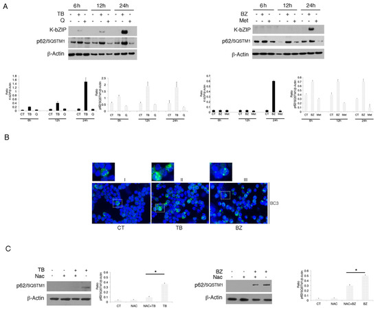 3.3. p62/SQSTM1 Up-Regulation is not Dependent on Autophagy Reduction at 6 and 12 h, while Autophagy Inhibition Contributes to Its Accumulation at 24 h after TB or BZ Treatments