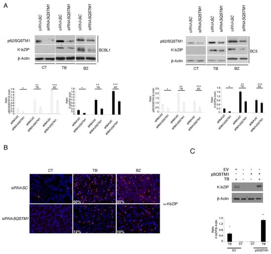 As p62/SQSTM1 expression increased in PEL cells undergoing TB or BZ, the same treatments that induced KSHV lytic cycle, the role of p62/SQSTM1 in this process was evaluated. We performed SQSTM1 knocking-down by using specific siRNA and found that it led to a reduction of K-bZIP expression in PEL cells treated with TB or BZ (Figure 5A). These results were confirmed by immunofluorescence experiments that showed a reduction of K-bZIP-positive cells after SQSTM1 silencing (Figure 5B), further indicating that p62/SQSTM1 plays a role in KSHV lytic antigen expression induced by TB or BZ in PEL cells. To confirm the importance of p62/SQSTM1 in supporting the KSHV lytic cycle, we also overexpressed this molecule by using a plasmid expression vector and, as shown in Figure 5C, p62/SQSTM1 overexpression caused increased K-bZIP expression in TB-treated cells.
