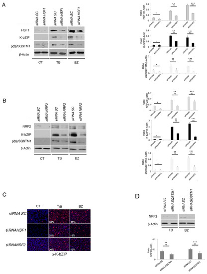 HSF1 and NRF2 RNA interference reduces K-bZIP expression in TB- or BZ-treated PEL cells. (A) HSF1 and (B) NRF2 knocking-down by specific siRNA decreased K-bZIP and p62/SQSTM1 expression in BCBL1 treated with TB or BZ. Densitometric analysis was performed using Image J software and the ratio of K-bZIP, HSF1, NRF2 or SQSTM1 versus β-Actin was calculated. Histograms represent the mean ± standard deviation (SD) of at least three independent experiments. p* < 0.05 (siRNA HSF1 or siRNA NRF2 vs siRNA SC), p** < 0.05 (siRNA HSF1 or siRNA NRF2 vs siRNA SC, TB-treated) and p*** < 0.05 (siRNA HSF1 or siRNA NRF2 vs siRNA SC, BZ-treated). (C) Immunofluorescence analysis of K-bZIP expression (red) in HSF1 and NRF2 knocked-down cells treated for 24 h with TB or BZ. DAPI was used to stain nuclei (blue). Percentage of K-bZIP-positive cells is also indicated. Objective magnification 20×. (D) NRF2 expression in SQSTM1 knocked-down cells, induced to lytic replication by TB or BZ, as evaluated by western blotting. Densitometric analysis was performed using Image J software and the ratio of NRF2 versus β-Actin was calculated. Histograms represent the mean ± standard deviation (SD) of three independent experiments. p** < 0.05 (siRNA SQSTM1 vs siRNA SC, TB-treated), and p*** < 0.05 (siRNA SQSTM1 vs siRNA SC, BZ-treated).