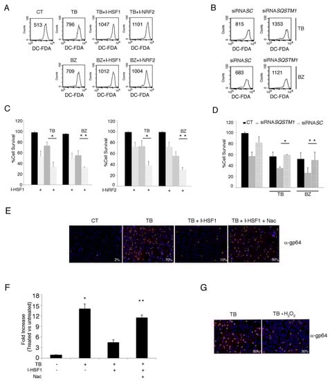 3.6. The Inhibition of HSF1, NRF2 and p62/SQSTM1 (siRNA) Further Increases ROS and Cytotoxicity Induced by TB or BZ in PEL Cells