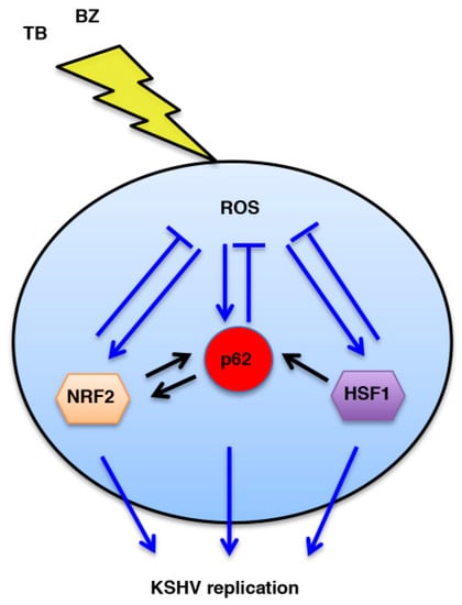 Schematic model. Interplay between HSF1, NRF2 and p62/SQSTM1 proteins and ROS intracellular production during KSHV replication induced by TB or BZ tratements.