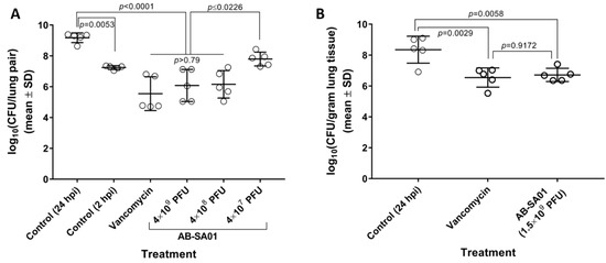 In a follow-up experiment using the final AB-SA01 composition (Figure 3B), a 1.5 × 109 total PFU dose group was tested in immunocompetent BALB/c mice. At 24 hpi, lung homogenates from mice that had received two doses of AB-SA01 contained statistically fewer bacteria than those from untreated mice (p = 0.0058), and were statistically equivalent to mice that had received three doses of vancomycin (p = 0.9172). The mean reductions in lung bacterial load relative to the untreated control were 1.64 log10CFU for AB-SA01-treated mice and 1.80 log10CFU for vancomycin-treated mice.
