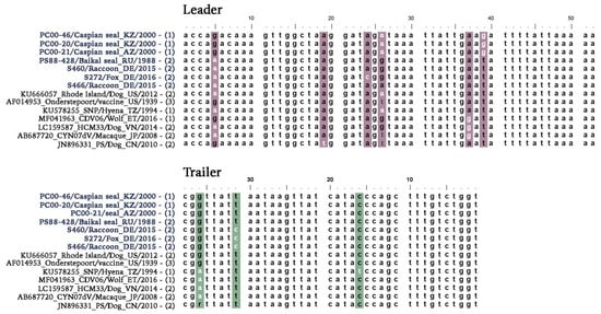 Genome termini alignment of CDV sequences. Nucleotide changes identified within the leader and trailer sequences of CDV genomes are highlighted in color. Selected sequences were generated in this study and other studies by next-generation sequencing (NGS, (1), (RACE, 2) or RNA ligation combined with PCR (3).