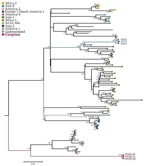 Maximum-likelihood phylogenetic analyses of full-length genomes (Figure 2) and H gene sequences (Figure 3) showed that CDVPS88-428, the oldest recovered sequence of a wild-type CDV strain, grouped within the Arctic clade, as expected on the basis of previous analyses [,]. However, it diverged from strains within the same clade that are circulating in Siberian tigers (Panthera tigris altaica) in Russia and in domestic dogs (Canis lupus familiaris) and red foxes in Italy (Figure 2). Sequence comparison between the H protein of CDVPS88-428 and another CDV Baikal seal strain (GenBank accession no. CAA59357.1) from 1988 showed six amino acid changes: M26V, I27T, I84V, V103I, S268T, P410T. Caution must be applied with respect to ascribing these differences to natural variation, as the previously published hemagglutinin sequence was derived from a virus isolate which had been adapted to growth in Vero cells []. However, variation was also observed between Caspian CDV sequences at amino acid 410 (I/M). The strains circulating in German wild carnivores grouped within the Europe-1 clade (Figure 2 and Figure 3) and are related to an older strain (CDV5804) found in a domestic dog in 1989, with only minor nucleotide changes identified between raccoon and fox CDV sequences. The Caspian seal CDV strain forms its own clade, tentatively named Caspian, grouping with the America-1 clade primarily comprised of vaccine and laboratory-adapted strains (Figure 2 and Figure 3). CDVPC00 showed 89.5–93.7% sequence identity to all other CDV strains, with 80 unique amino acid changes (Table 2), making this a newly identified strain in a separate clade. Moreover, within the three recovered strain variants PC00-46, PC00-21, and PC00-21, unique genomic differences were detected. These include 16 synonymous and 3 nonsynonymous mutations when using using PC00-46 as the reference strain variant, with amino acid changes in phosphoprotein (P90L), F glycoprotein (M126T), and H glycoprotein (I410M) (Table S3). No changes in the consensus were detected between full-length genome sequences recovered from different tissues originating from the same animal.