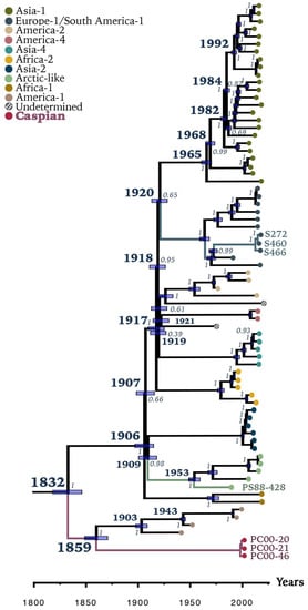 - Rambaut, A.; Lam, T.T.; Max Carvalho, L.; Pybus, O.G. Exploring the temporal structure of heterochronous sequences using TempEst (formerly Path-O-Gen). Virus Evol. 2016, 2, vew007. [Google Scholar] [CrossRef] [PubMed]