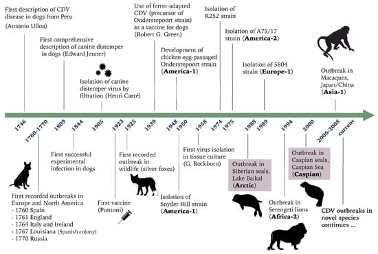 The origins of CDV (Figure 5), inferred from historical literature, are much later than those of the closely related measles virus and rinderpest virus. CDV is suspected to have originated in South America and spread to Europe in the mid-18th century, with the first description of a disease syndrome resembling canine distemper, reported to be similar to measles in dogs in Peru, made in 1746 by Antonio de Ulloa [,]. Shortly thereafter, the disease reached Europe with a deadly disease outbreak among dogs reported in Spain in 1760. During the 1760s, the epizootic subsequently spread to other countries including France, England, Ireland, Germany, Italy, and Russia, resulting in the deaths of thousands of dogs []. Although it can be assumed that wildlife was exposed to CDV throughout the late 18th and 19th century, the first report of CDV in a wildlife carnivore species was in 1925 following outbreaks of distemper in captive silver foxes (V. vulpes) in the USA []. The first attempts to control the spread of distemper was made in 1923, following the development and testing of the first experimental vaccine []. The subsequent introduction of more efficacious commercial CDV vaccines for domestic dogs in the mid-20th century [] has not prevented the continual endemic transmission of CDV in wild carnivores species, as CDV continues to cause outbreaks in wildlife worldwide with occasional spillover into domestic dogs in countries with high rates of vaccination [,,]. In contrast to the successful eradication campaign of rinderpest virus, the high capacity of CDV for sustained interspecies transmission means that prospects for eradication of this disease are remote. Moreover, CDV appears to have a much wider or expanding host range than was previously recognized, given the large number of new host species that have been infected in recent years including rhesus macaques, giant pandas (Ailuropoda melanoleuca), tigers, and seals (phocid species/pinnipeds), with associated high rates of morbidity and mortality [,,,,].