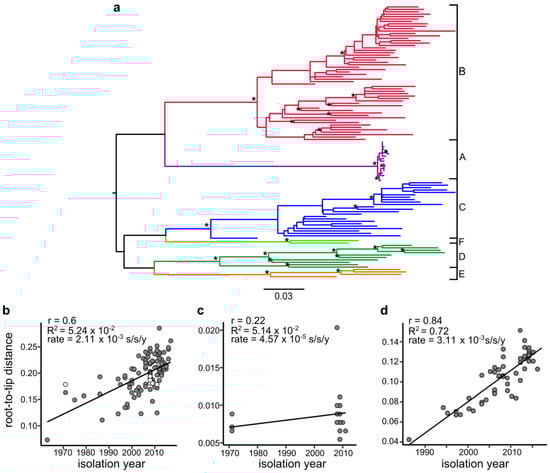 - Rambaut, A.; Lam, T.; Carvalho, L.; Pybus, O. Exploring the temporal structure of heterochronous sequences using TempEst (formerly Path-O-Gen). Virus Evol. 2016, 2, vew007. [Google Scholar] [CrossRef] [PubMed]