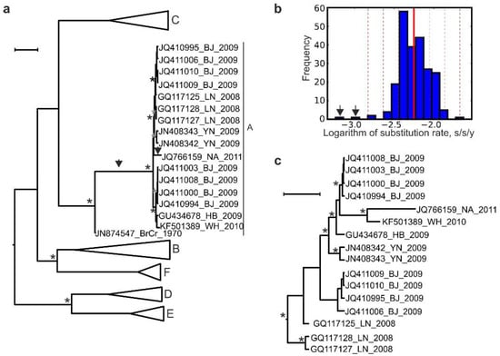 (a) Maximum clade credibility (MCC) tree for EV-A71 sequences of different subtypes and 16 BrCr-like Chinese isolates. The scale bar below the tree corresponds to 10 years. Subtypes other than A are collapsed for graphical reasons. The asterisks indicate node posterior probabilities above 0.85. (b) Frequency distribution of branch substitution rate logarithms in the MCC tree shown in panel (a). The solid red line indicates the mean, and the dashed lines indicate standard deviations from the mean. (c) MCC tree for 16 BrCr-like Chinese sequences. The scale bar below the tree corresponds to one year. Abbreviations in Chinese sequences’ names correspond to the cities or provinces of isolation: BJ—Beijing, HB—Hubei province, LN—Luan, WH—Wuhan, YN—Yunnan, NA—unknown.