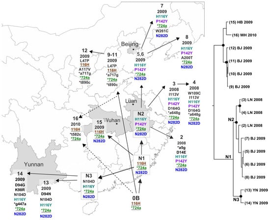 Upon introduction, the virus diverged into two or three lineages. One of them was detected in Beijing in 2009 [] (Figure 3, sequences 9–12) and had one additional amino acid and two synonymous nucleotide substitutions. Another lineage spread all over Southeast China; its typical feature was an N282D substitution, which is very rare among other EV-A71 sequences (33 sequences out of 7026) and supports a common origin for this group. In some of these viruses, the 116H amino acid reverted to the 116Y variant, which is very common among circulating EV-A71. Presence of a very rare N282D substitution in all 116Y sequences supports the aforementioned sequence of events and thus a single contamination event rather than introduction of two distinct virus variants, one with 116H and another with 116Y polymorphisms. The major N282D lineage included two hypothetical intermediate strains (Figure 3, N1 and N2), which further diverged into lineages found in Luan (Anhui province) in 2008 (sequences 2–4), the Yunnan province 2009 lineage (N3 ancestor and sequences 13 and 14), the Beijing 2009 lineage (Figure 3, sequences 5–8) [], and the Hubei province 2009–2010 lineage (Figure 3, sequence 15) []. These lineages carried unique characteristic mutations and gained additional substitutions during circulation. The origin of sequence 16 remains uncertain, because it could result from a direct spread of the original virus to Hubei province, from a common ancestor with Beijing sequences, or from an independent introduction. Phylogenetic analysis was generally compatible with this sequence of events (Figure 3). Putative intermediate sequences N1, N2, and N3 corresponded to distinct tree nodes. However, there was one notable exception. Phylogenetic analysis placed sequence 15 together with isolates 9–12 and 16. This topology could be justified by the number of substitutions, but knowing that the N282D mutation is very rare in EV-A71, it appears more parsimonious that it emerged just once in the putative ancestor N1.