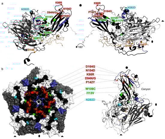 Mapping of 14 amino acid substitutions found in Chinese BrCr-like isolates. The residues are colored according to the structural region of the capsid: the canyon northern rim (red), canyon floor and its proximity (green), canyon southern rim (cyan), and other regions (orange), based on the EV-A71 structure 4CDQ []. Residues that belong to the major epitopes of VP1 [] are colored in dark blue. (a) Side views of a cartoon representation of the EV-A71 icosahedral asymmetric unit; (b) surface residues mapped to the molecular surface of EV-A71 pentamer formed by five icosahedral asymmetric units (left) and a single icosahedral asymmetric unit in cartoon representation (right) viewed down a five-fold axis. The capsid VP1 protein is colored in black, VP2 colored in grey, VP3 colored in white, and VP4 colored in wheat. Positions of the icosahedral symmetry elements are indicated. The visualization of EV-A71 crystal structure was performed in PyMOL [].