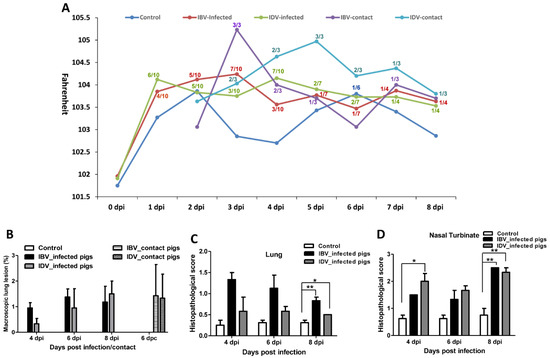 Body temperature, macroscopic, and microscopic lungs lesions of contact or infected pigs with influenza B virus (IBV), or influenza D virus (IDV). (A) The body temperature of infected or contact pigs is presented as the average body temperature of each group of pigs at indicated days. The number, such as 6/10, means that 6 out of 10 IDV-infected pigs showed fever at a defined dpi. (B) Macroscopic lung lesions of infected or contact pigs are presented as the average percentage ± SEM of gross lesions of three or four pigs in each group at the indicated days. (C,D) Microscopic lung (C) and nasal turbinate (D) lesions of infected pigs are presented as the Mean ± SEM of lesions of three or four pigs in each group at the indicated days. The asterisks (*) represent a statistically significant difference between groups (*: p < 0.05; **: p < 0.01).