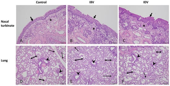 Histologic nasal turbinate and lung sections from pigs infected with either IBV or IDV at 8 days post-infection. Top Row: Nasal turbinate sections from control and infected pigs. Turbinate from control (A) have normal ciliated respiratory epithelium (arrow) and minimal inflammatory cells in lamina propria (asterisk). The IBV (B) or IDV (C) infected nasal turbinates have prominent segment of squamous epithelium/metaplasia (arrow) with infiltrating neutrophils through lamina propria and epithelium and increased lymphocytes in lamina propria (asterisks). Bottom Row: Lung sections from control (D) and infected pigs (E,F) taken after collection of lavage. Lungs infected with IBV (E) have prominent diffuse interstitial pneumonia with increase in cellularity of alveolar septae (double arrows), along interlobular septae (single arrows), and with prominent (though mild) peribronchiolar lymphocytes (arrowheads). Lungs infected with IDV (F) have milder diffuse interstitial pneumonia (increased thickening and cellularity of alveolar septae including along interlobular septae) and minimal peribronchiolar inflammation. Lungs of control pigs have minimal increased cellularity noted components. Bars for nasal turbinate and lung section are 100 and 200 µm, respectively.