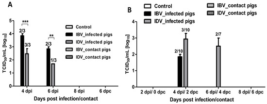 Virus titers in BALF and nasal swab samples collected from contact or infected pigs with IBV or IDV. (A) Mean of virus titers in BALF from contact or infected pigs with either IBV or IDV at indicated days. (B) Mean of virus titers in nasal swabs from contact or infected pigs infected with either IBV or IDV at indicated days. None of the contact pigs had virus in lung or nasal turbinates. Determination of virus titers was performed by calculating the 50% tissue culture infective dose (TCID50)/mL in Madin–Darby canine kidney (MDCK) cells using indirect immunofluorescence assay (IFA). The number of pigs with positive virus isolation out of the total number of tested pigs is presented above of each bar. The error bars represent SEM. The asterisks (*) represent a statistically significant difference between groups (**: p < 0.01, and ***: p < 0.001).