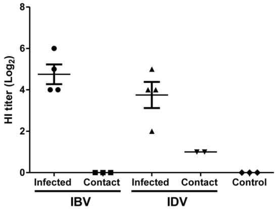 Hemagglutination inhibition (HI) titer of serum samples from contact or pigs infected with IBV or IDV at 8 dpi (6 dpc). HI assay was performed for serum samples collected from three control pigs, three contact pigs, and four infected pigs at 8 dpi based on a standard protocol. HI titer ≥ 20 is judged as positive.
