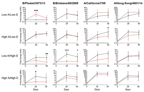 Estimated fold change in hemagglutination inhibition (HAI) responses compared between placebo (black) and vitamin A and D supplement (A&D, red) study groups at different time points of the study in season 2016–2017. Participants were placed into one of four groups based on vitamin levels. Cut-offs for sufficiency (termed “high”) were ≥ 22,000 ng/mL for retinol-binding protein (RBP) and ≥ 30 ng/mL for 25(OH)D. Groups were “Low A/Low D”, n = 10; “High A/Low D”, n = 12; “Low A/High D,” n = 11; “High A/High D,” n = 11 (see Table 2). For each of the four viruses, the GEE model was constructed with log2-transformed HAI titers as the response, age, race, and a three-way interaction among time, incoming vitamin levels, and study groups as covariates, and the first order autoregressive (AR1) as the working correlation structure. Estimated mean fold changes are plotted with 90% confidence intervals. p-values were obtained from post hoc comparisons from GEE models (* p < 0.05, ** p < 0.01, *** p < 0.001).
