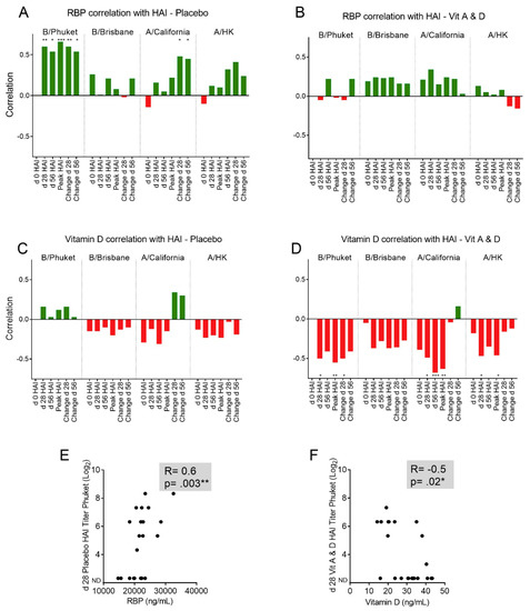 The negative correlation was more pronounced in the A&D group (Figure 2D) compared to the placebo group. Individual patient data for two of these correlations are shown in Figure 2E–F. As shown, the baseline RBP value was positively and significantly correlated with the day 28 HAI response toward B/Phuket/3073/13 in the placebo group (r = 0.6, p = 0.003, Figure 2E), and the baseline 25(OH)D value was negatively and significantly correlated with the day 28 HAI response toward B/Phuket/3073/13 in the A&D group (r = −0.5, p = 0.02, Figure 2F).