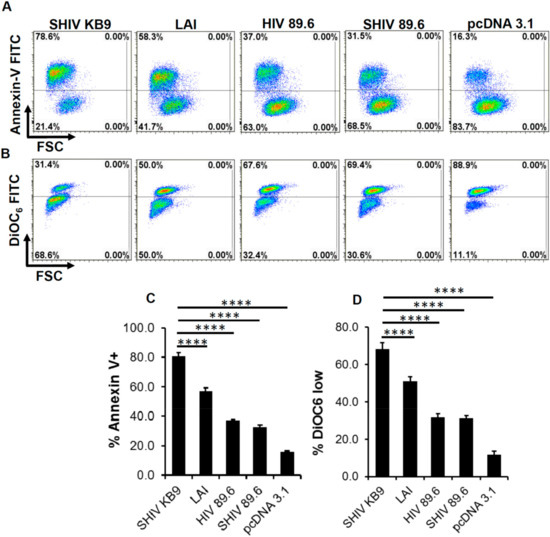 SHIV KB9 Env mediates higher apoptosis in bystander CD4+ T cells. HeLa cells were transfected with pSHIV-Env (KB-9 or 89.6), pHIV-1-Env (89.6 or Lai) or control vector pcDNA3.1 and co-cultured with the SupT1 cell line. Apoptosis was detected either via annexin V staining or DiOC6 staining 24 hours post co-culture. Representative dot plots for annexin V (A) and DiOC6 staining (B) are shown. Apoptosis induction by different Envs as determined by Annexin V (C) or DiOC6 staining (D) is shown. Data are mean ± SD of triplicate observations. p ≤ 0.0001 as determined by one-way ANOVA followed by Dunnett’s multiple comparison test. All experiments were repeated with similar results.