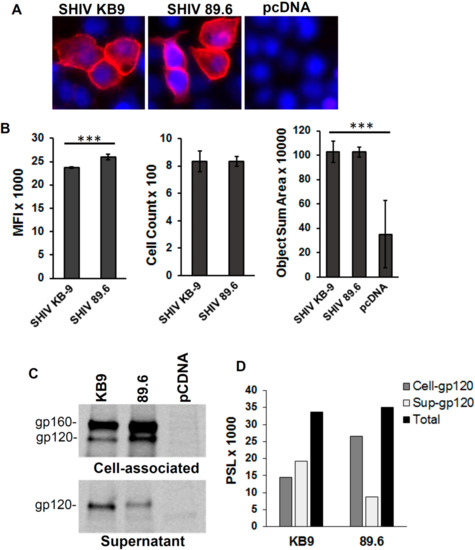 Env expression and Env shedding for KB9 and 89.6 Envs. HeLa cells were transfected with Env expression constructs for KB9, 89.6 or control pcDNA3.1 vector. Surface Env expression was determined 48 hrs post transfection after staining with the b12 antibody flowed by fluorescence microscopy (A). Whole wells of 96-well plate were scanned to determine MFI, positive cell counts and object sum area. p ≤ 0.0001 as determined by one-way ANOVA (B). HeLa cells were transfected as above and Env shedding was determined after radiolabeling of cells with [35S] Met/Cys followed by immunoprecipitation of cell lysates and supernatants using HIV Ig (C). Quantitation of cell associated and shed gp120 (D). One representative of two independent experiments is shown.