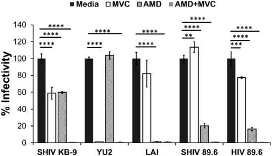 Variable coreceptor usage by SHIV Envs. HIV-1 virions pseudotyped with indicated Envs were used to infect TZM-bl indicator cell line. Pseudotyped virus infections were conducted in the presence of inhibitors Maraviroc (MVC), AMD 3100 (AMD), a combination of both AMD and MVC (AMD + MVC) or no inhibitor (media). Virus infectivity was determined 72 h later by measuring luciferase activity. **** = p ≤ 0.0001; *** = p ≤ 0.001; ** = p ≤ 0.01 as determined by one-way ANOVA followed by Dunnett’s multiple comparison test.