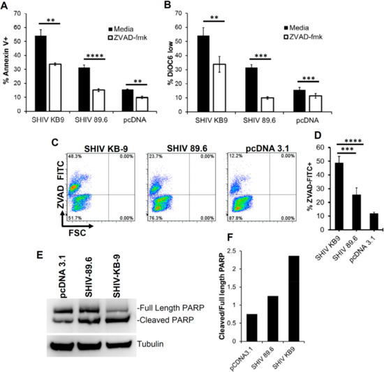 Bystander apoptosis mediated by SHIV KB9 is caspase dependent. HeLa cells expressing SHIV Env were cocultured with SupT cell in the presence or absence of pan caspase inhibitor ZVAD-fmk. Apoptosis was detected 24 h later using Annexin V (A) or DiOC6 staining (B). **** = p ≤ 0.0001; *** = p ≤ 0.001; ** = p ≤ 0.01 as determined by two tailed unpaired t-test. Activation of caspases in HeLa Env-SupT cocultures was detected by staining with ZVAD-FITC. Representative dot plots are shown (C) and data from triplicate observations is shown in (D). **** = p ≤ 0.0001; ** = p ≤ 0.01 as determined by one-way ANOVA followed by Dunnett’s multiple comparison test. PARP cleavage was detected in SupT cells cocultured with HeLa cells transfected with different SHIV Envs or control vector. Western blot of PARP protein levels and tublin control is shown in (E). Quantitation of PARP cleavage as ratio of cleaved PARP/total PARP is shown in (F).