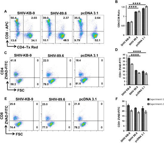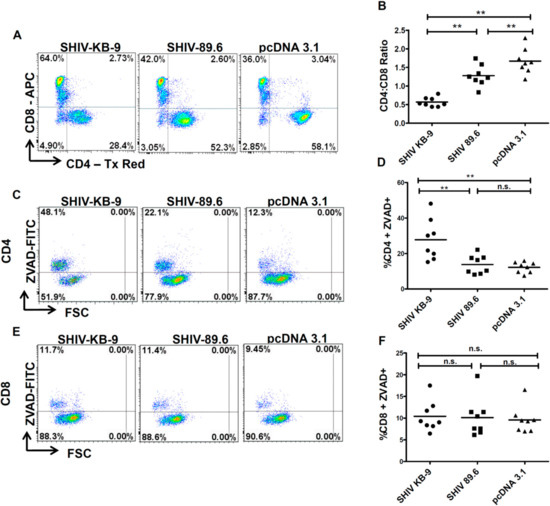 3.7. Coculture of SHIV KB9 Env Expressing Cells with Unstimulated PBMCs Results in a Specific Loss of CD4+ T cells Via Apoptosis