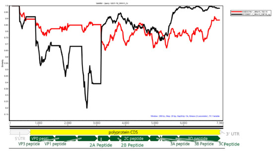 Possible recombination was investigated by comparing the HPeV5 genome obtained from G001-19 against the two nearest complete HPeV3 and HPeV5 sequences from GenBank: AM23749.1 HPeV5 T92-15 detected in California in 1992 and KY55671.1 HPeV3 CSF19, detected from Australia in 2013 in Simplot [14] using a window size of 200 and step size of 20.