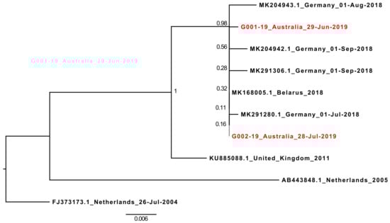 At the time of writing (August 2019), only nine full-length HPeV5 genomes were available on GenBank. However, 76 near-complete HPeV5 VP1 sequences were available, and these were downloaded and aligned with the 696nt VP1 sequences of G001-19 and G002-19. After excluding any sequences with ambiguous bases, or those which were significantly truncated at either the 5’ or 3’ end of the gene (which included the partial VP1 from cases V1 and V5), a final alignment of 567 nucleotides from 72 HPeV5 VP1 sequences was created, and a corresponding maximum-likelihood phylogenetic tree generated (Supplementary Figure S1). The 2019 Australian HPeV5 VP1 sequences ranged in nucleotide similarity between 77% and 100% with international HPeV5s, but were only 80.78%–80.95% similar to HPeV5’s detected in Queensland, Australia, in 2012 and 2013 (GenBank accessions: MH931514.1 and MG712788.1) [18,19], and most closely related (92%–100% similarity) to a lineage of HPeV5 viruses detected in several countries across Europe between 2004 and 2018. Of these, the recombinant HPeV5 VP1 was most similar to the most recent sequences reported in 2018 from Germany (all >99.5% similarity) and Belarus (100% similar to G002-19) [6] (Figure 2).