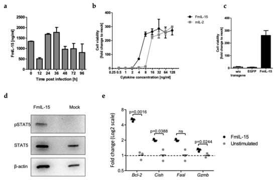 Functionality of secreted FmIL-15 was tested in a lymphocyte proliferation assay with starved cytokine-dependent CTLL-2 cells. Defined concentrations of FmIL-15 from infected cell supernatants were able to provide an equally strong or stronger stimulus for lymphocyte proliferation when compared to rmIL-2 (Figure 2b). To exclude non-specific stimulation of lymphocyte proliferation by other viral or cellular components, CTLL-2 cells were cultured in supernatants of cells infected with different MeVac variants (Figure 2c). In contrast to supernatants from cells infected with MeVac ld FmIL-15 Hbl-αCEA, supernatants from cells infected with parental or EGFP-encoding MeVac did not promote survival of the cytokine-dependent lymphocytes. To demonstrate functional activity of FmIL-15 on a molecular level, cell lysates of CTLL-2 cells stimulated with FmIL-15 were probed for phosphorylated STAT5 (Figure 2d). Phosphorylated STAT5 was detected in CTLL-2 cells stimulated with FmIL-15, but not in controls, indicating activation of JAK/STAT signaling by FmIL-15. RT-qPCR was performed for several IL-15 target genes (Figure 2e). Expression levels of Bcl-2, Cish, and Gzmb mRNA were found to be significantly increased upon stimulation of CTLL-2 cells with FmIL-15 secreted from infected cells.
