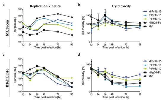 In this study, a murine colorectal adenocarcinoma model, MC38cea, and a murine melanoma model, B16hCD46, were used, which are both syngeneic to C57BL/6 mice. Prior to in vivo experiments, replication kinetics and cytotoxicity of the recombinant measles viruses were evaluated. Viruses used in the MC38cea model harbor a hemagglutinin variant that allows cell entry via CEA, while viruses used in the B16hCD46 model harbor unmodified hemagglutinin. To analyze growth kinetics, one-step growth curves were generated after infection of MC38cea and B16hCD46 (Figure 3a,c). It should be noted that measles virus is adapted to primate cells and viral replication is thus impaired in murine cells []. All viruses were clearly attenuated in the murine cells compared to primate Vero or Vero-αHis cells (Supplementary Materials Figure S1). For most viruses, titers peaked at 36 to 48 h.p.i. Direct virus-induced cytotoxicity was assessed by cell viability assay at depicted timepoints after infection (Figure 3b,d). Viability of MC38cea cells was only mildly affected by infection with the measles virus vectors, with no overt differences between the different variants. B16hCD46 appeared to be more permissive to the MV vectors. Inoculation with MeVac ld FmIL-15, the most attenuated virus in this experiment, led to a decrease in cell viability to about 50% of mock-treated cells, while infection with MeVac P FmIL-15 reduced cell viability to 20%. Direct cytotoxic effects exerted by MeVac P FmIL-12 were slightly stronger than those exerted by MeVac H IgG1-Fc and parental MV, all of which reduced cell viability to about 40% of mock infection.