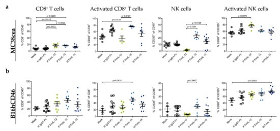 To study the effects of treatment with immunomodulatory oncolytic MV on the composition of tumor-infiltrating lymphocytes (TILs), C57BL/6J mice bearing subcutaneous syngeneic MC38cea or B16hCD46 tumors received intratumoral injections of the different MeVac vectors and flow cytometry was performed 24 h after the last treatment. In the MC38cea model (Figure 4a), the CD8+ T lymphocyte fraction among CD45+ cells was significantly increased by local immunotherapy with MeVac P FmIL-12 Hbl-αCEA or MeVac P FmIL-15 Hbl-αCEA. Treatment with MeVac P FmIL-15 Hbl-αCEA led to a significant increase in the CD69+ fraction of CD8+ T cells, indicating increased cytotoxic T lymphocyte activation. A similar trend was seen with MeVac ld FmIL-15 Hbl-αCEA and MeVac H IgG1-Fc Hbl-αCEA. As observed in earlier experiments [], treatment with MeVac P FmIL-12 Hbl-αCEA led to a depletion of intratumoral NK cells. NK cell abundance among CD45+ cells in tumors was significantly increased after treatment with MeVac P FmIL-15 Hbl-αCEA, in comparison to MeVac P FmIL-12 Hbl-αCEA, and a similar, but weaker effect was seen using MeVac ld FmIL-15 Hbl-αCEA. Activation of NK cells, as determined by CD69 expression, was increased in tumors treated with MeVac P FmIL-12 Hbl-αCEA, consistent with data published earlier by Veinalde et al. [].