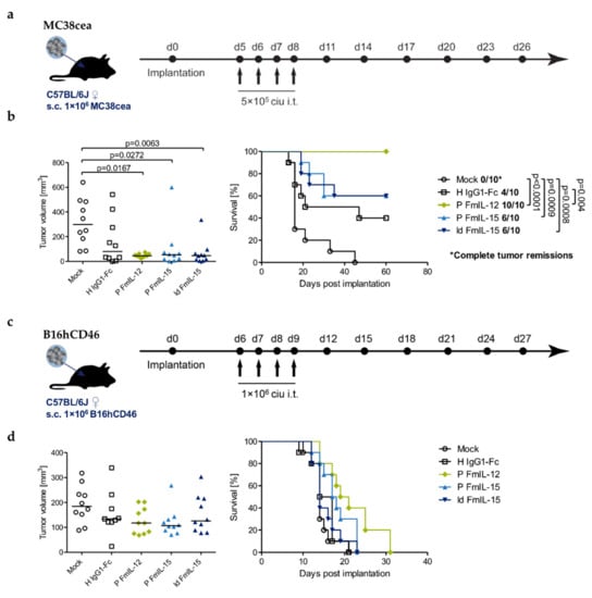 In the MC38cea model, treatment with MeVac H IgG1-Fc induced a complete tumor remission in four out of ten mice. MeVac ld FmIL-15 Hbl-αCEA and MeVac P FmIL-15 Hbl-αCEA induced a complete remission in six out of ten individuals. Overall, neither significantly prolonged survival compared to MeVac H IgG1-Fc Hbl-αCEA. Therapeutic efficacy was significantly increased for MeVac P FmIL-12 Hbl-αCEA, which achieved a complete remission in all ten animals (Figure 5b).