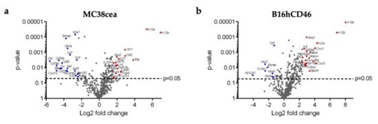 Immune expression profiling. RNA was extracted from n = 4 tumors from each treatment group and expression profiling was carried out using the NanoString Mouse Immunology Panel. Volcano plots show differential gene expression between the FmIL-15 and FmIL-12 treatment groups in the (a) MC38cea and (b) B16hCD46 tumor models. Each dot represents one gene. The top 20 significantly upregulated genes in the FmIL-12 versus the FmIL-15 group (Log2 Fold change >1 and p-value < 0.05) are shown in red. The top 20 significantly downregulated genes in the FmIL-12 versus the FmIL-15 group (Log2 Fold change <−1 and p-value < 0.05), i.e., upregulated in the MeVac FmIL-15 group, are shown in blue.