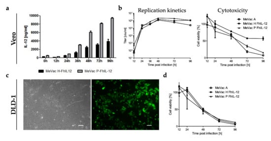 These results prompted us to generate oncolytic MeVac vectors encoding a human IL-12 fusion protein (FhIL-12) in analogy to the MeVac FmIL-12 vectors. We chose to insert the FhIL-12 cassette either downstream of the P or H open reading frames, yielding MeVac P FhIL-12 and MeVac H FhIL-12 after successful rescue. Secretion of FhIL-12 into the supernatant of infected cells was confirmed by ELISA (Figure 8a). As a result of the transcription gradient within the measles virus genome [], infection with MeVac P FhIL-12 resulted in higher expression levels compared to MeVac H FhIL-12. In case of a potent immunostimulatory molecule such as IL-12, moderate expression levels may be beneficial to avoid both immune exhaustion and toxicity. Growth curve analyses showed that both FhIL-12 vectors have similar replication kinetics as parental MeVac and direct cytotoxicity is only slightly attenuated in primate Vero cells (Figure 8b). Based on our in vivo data in the MC38cea model, we considered colorectal cancer as a target tumor entity for MeVac FhIL-12. We tested a panel of human colorectal cancer cell lines for susceptibility to MeVac using a variant encoding EGFP to monitor viral gene expression (Figure 8c and Supplementary Materials Figure S6). All cell lines showed high rates of infection and pronounced EGFP expression already 24 h after inoculation. Further, cell viability assays revealed sensitivity of human colorectal cancer cell lines to MeVac oncolysis. As an example, cytotoxicity of parental MeVac and MeVac FhIL-12 vectors against DLD-1 cells is presented in Figure 8d.