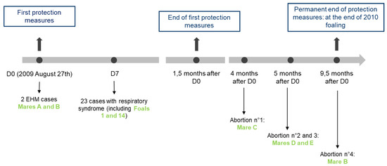 Overall, six of the 60 mares from this stud farm aborted during the year. EHV-1 infection was confirmed for mares B, C, D, and E. One of the two other mares aborted due to Enterobacter amnigenus infection, while no cause could be confirmed for the last mare (the dead foal could not be recovered).