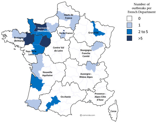 This epidemiological study involved the 2009 outbreak described in Section 3.1 and EHV-1 outbreaks from 2012 to 2018. Samples collected from 2012 to 2018 are represented in Supplementary Materials (Table S1). From 2012 to 2017, 42 respiratory cases, 44 abortion cases, 20 neurological cases, and six cases with no clinical information were reported. Significantly, in 2018, several outbreaks of EHV-1 occurred. During this year, an increased number of outbreaks (56 in total) were reported to the RESPE, including 15 respiratory outbreaks, 16 cases of abortion, five neurological outbreaks, and 20 outbreaks with no clinical information (see Table 4 and Figure 2). The majority of the outbreaks were reported on the western part of the country, which has the highest concentration of breeding farms. Neurological outbreaks occurred in Normandy and Brittany and lead to the euthanasia of five animals. From these outbreaks, 71 samples were received and analysed (i.e., 15 samples from respiratory cases, 19 samples from abortion cases and 18 samples from neurological cases; clinical information was missing for 19 samples). Of these 71 samples, 12 could not be typed for A2254G substitution (two samples from respiratory cases, one sample from an abortion case, six samples from neurological cases, and three samples missing clinical information).