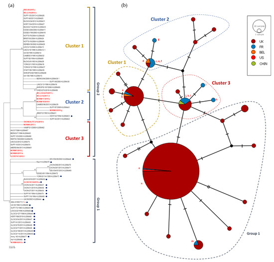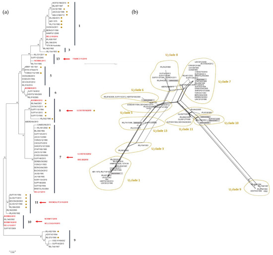 (a) Maximum Composite Likelihood method and Tamura-Nei matrix model phylogenetic tree based on ORF30 nucleotide sequences. Eighty-two strains including 14 strains isolated in France and Belgium from 2009 to 2018 (red bold text), 67 strains sequenced by Bryant et al. (2018) [14], and reference strain AY665713 (Ab4) are represented in this tree. Dots represent strains with the neuropathogenic type (G2254). Boostrap values after 1000 replication are indicated at major nodes. (b) Median Joining Network based on the same ORF30 nucleotide sequences as for the phylogenetic tree.