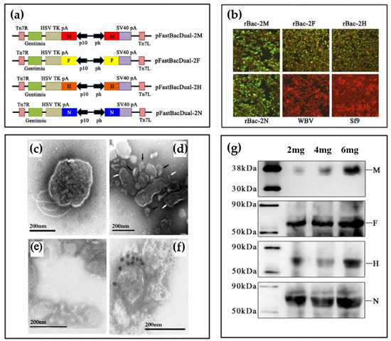 Generation and characterization of peste des petits ruminants virus (PPRV) virus-like particles (VLPs). (a) Schematic diagrams are presented for the recombinant plasmids pFastBacDual-2M, pFastBacDual-2F, pFastBacDual-2H, pFastBacDual-2N. (b) Detection of the expression of M, F, H and N. Sf9 cells were mock-infected or infected with recombinant baculoviruses rpFBD-2M, rpFBD-2F, rpFBD-2H, rpFBD-2N or wild-type baculovirus (WBV). Expression was evaluated by IFA using a mouse anti-PPRV M polyclonal antibody, mouse anti-PPRV F polyclonal antibody or sheep polyclonal antibodies against N and F. (c–f) Transmission electron microscopy images of virus and VLPs preparations. Native peste des petits ruminants virus (PPRV) (c), residual baculoviruses (indicated by black triangles) in preparations of VLPs (indicated by white arrow) (d), purified PPRV VLPs (e), and immunogold-labelled PPRV VLPs stained with mouse anti-PPRV H polyclonal antibody followed by gold-labeled goat anti-mouse IgG antibody (f). (g) Western blot depicting VLP protein expression using mouse anti-PPRV M or H polyclonal antibodies or sheep polyclonal antibody sera against N or F.