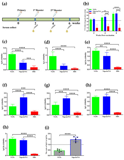 To further investigate the humoral response to PPRV VLPs, antigen-specific total IgG and antibody subtypes were confirmed by ELISA (Figure 2). The total serum IgA and IgM antibody titers from VLP-immunized mice were significantly higher than those observed for PPRV Nigeria 75/1 and the PBS control (Figure 2c,d). Likewise, PPRV VLPs induced a stronger IgG2a response than PPRV Nigeria 75/1 but a weaker IgG1 and IgG3 response (Figure 2e–g). There was no significant difference in total serum IgG and IgG2b among VLP-immunized and PPRV Nigeria 75/1-immunized groups (Figure 2h,i). Interestingly, the low ratio of IgG1 to IgG2a in VLP-immunized mice suggested the activation of Th1-type immune response, whereas the opposite phenomenon in PPRV Nigeria 75/1-immunized mice suggested the activation of Th2-type immunity [29] (Figure 2j). Overall, the data above support the conclusion that VLPs elicit a strong and broad antibody subclass response in mice, similar to that elicited by the Nigeria 75/1 vaccine.