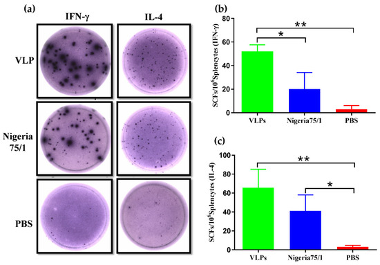 After confirming that VLPs successfully induced a broad antibody response in mice, we next sought to evaluate the induction of a cell-mediated immune response. The antigen-specific IFN-γ and IL-4 activities in splenocytes were evaluated by ELISpot assays (Figure 3a). Spot-forming cells (SFCs) of IFN-γ and IL-4 from the splenocytes of VLP-immunized mice were significantly more numerous than those observed from PBS-immunized mice (Figure 3b,c). Although VLPs were found to induce a much greater IFN-γ response in mice than PPRV Nigeria 75/1, no significant difference in IL-4 responses among VLPs and PPRV Nigeria 75/1 groups were observed.