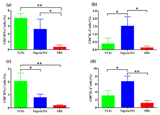 To further characterize the ability of PPRV and VLPs to produce specific T cell responses, CD4+ and CD8+ splenocytes were labeled for IFN-γ or IL-4. VLPs elicited a robust IFN-γ-secreting CD4+ T cell response in contrast to PPRV Nigeria 75/1, which elicited a significantly greater IL-4-secreting T cell response (Figure 4a,b). Similarly, the percentage of CD8+IFN-γ+ T cells was significantly higher in the VLP group compared to the PPRV Nigeria 75/1 group, while the opposite was true for CD8+IL-4+ (Figure 4c,d). These data demonstrate that mice immunized with VLPs elicited a notably enhanced T cell response induced by IFN-γ.