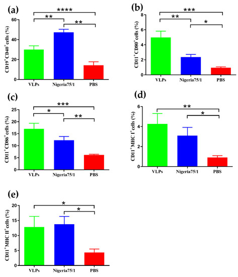 To investigate whether VLPs can induce the production of B cells and dendritic cells (DC), cells from inguinal lymph nodes were analyzed using flow cytometry. Mice immunized with VLPs or PPRV Nigeria 75/1 induced a greater production of CD19+CD40+ cells (B cells) than PBS alone; however, PPRV Nigeria 75/1 induced significantly higher levels of CD19+CD40+ cells than VLPs (Figure 5a). Conversely, the levels of CD11c+CD80+ and CD11c+CD86+ cells (DCs) in the lymph nodes of VLP-immunized animals were significantly higher than those immunized with PPRV Nigeria 75/1 and the PBS control group (Figure 5b,c). Compared with PBS, both VLPs and PPRV Nigeria 75/1 induced higher levels of MHC I and MHC II expression in vaccinated mice, although there was no significant difference in expression between the VLP- and PPRV Nigeria 75/1-immunized groups (Figure 5d,e). Taken together, these results indicate that VLPs and PPRV Nigeria 75/1 can recruit and/or activate more B cells and DCs in inguinal lymph nodes and also elicit high levels of expression of MHC I and MHC II on the surface of activated DCs.