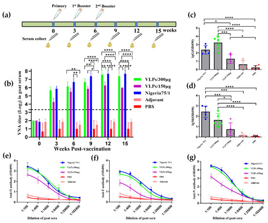 To evaluate the immunogenicity of VLPs, neutralizing antibody titers in goat serum were determined using a micro-neutralization assay. Goats were immunized with 150 or 300 µg VLPs or 105 TCID50 Nigeria 75/1, while control animals were immunized with either PBS or the alum adjuvant alone (Figure 6a). Three weeks after the first immunization, the VNA titers in goats vaccinated with VLPs or PPRV exceeded 10 [31,32] (Figure 6b). Nine weeks after the primary vaccination, the value was significantly increased again, reaching levels of 27–28 in the animals immunized with VLP (300 µg) and PPRV Nigeria 75/1. The data showed that the neutralizing antibody response in PPRV Nigeria 75/1 is higher than that induced by VLPs in goats (target animals), although the differences were not statistically significant. Goats immunized with 300 µg of VLPs induced higher levels of neutralizing antibodies—starting from the third week after the first immunization—compared to goats immunized with 150 µg of VLPs, but the differences were not significant until the twelfth week after immunization, and no neutralization activity was detected in pre-immune serum or in serum from animals immunized with either PBS or adjuvant (Figure 6b). The average levels of IgG (Figure 6c) and IgM (Figure 6d) in animals immunized with 300 µg VLPs were as high as those immunized with PPRV Nigeria 75/1, after the third immunization. Animals immunized with 150 µg VLPs also exhibited a specific IgG and IgM response, although it was significantly lower than the responses elicited by PPRV Nigeria 75/1 and the 300 µg VLP dose. Immune responses against the PPRV F, H, and N proteins were evaluated by ELISA (Figure 6e,f,g). All goats in the VLP- and PPRV Nigeria 75/1-immunized groups developed high levels of antibodies against PPRV F, H, and N proteins after the third immunization, whereas none of the goats immunized with PBS or alum adjuvant alone demonstrated an immune response. We also have used the commercial PPRV ELISA kit (IDvet, France) to repeat the ELISA. The results showed that although the OD values are different from the ELISA method established in this study, the trends of the curves are consistent. Taken together, these data show that VLP immunization induced significantly high levels of serum neutralizing antibodies comparable to PPRV Nigeria 75/1.