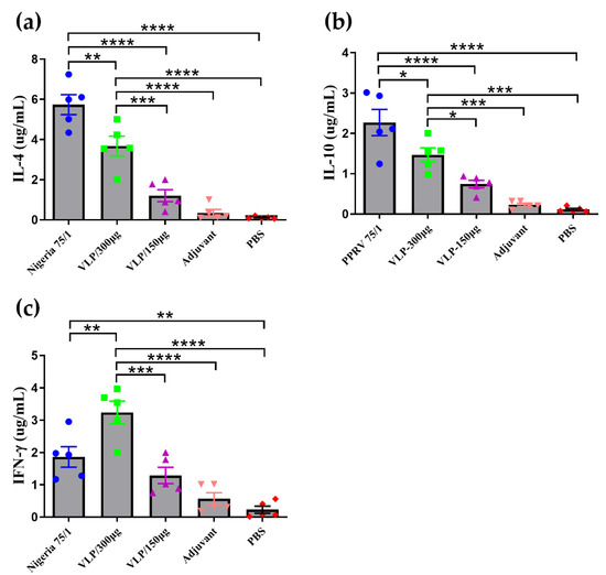To evaluate the cytokine response induced by PPRV Nigeria 75/1 and VLPs, we quantified the levels of IL-4 (Figure 7a), IL-10 (Figure 7b) and IFN-γ (Figure 7c) in vaccinated animals. Overall, animals vaccinated with 300 µg VLPs exhibited significantly higher levels of these three cytokines than animals given the lower dose or the control animals that received adjuvant or PBS only. Although animals vaccinated with 150 µg VLPs exhibited increased cytokine levels compared to the control animals, the differences were not significant. IL-4 and IL-10 levels induced by PPRV Nigeria 75/1 were significantly higher than in the control animals or animals vaccinated with VLPs, whereas the IFN-γ levels were significantly lower than in animals vaccinated with 300 µg VLPs.