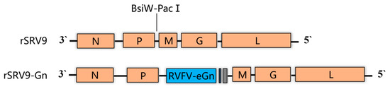 To generate a rSRV9 expressing the RVFV eGn glycoprotein, we used the rSRV9 vector. A codon-optimized RVFV eGn cDNA was cloned into rSRV9 using the BsiWI and PacI restriction sites that flank an rSRV9 transcription start/stop signal between the rSRV9 P and M genes. The rSRV9-eGn construct (Figure 1) expressed a chimeric protein containing the ectodomain of the RVFV M gene C-terminal region (nt 411–1746) and the entire transmembrane domain and cytodomain tail of the rSRV9 G glycoprotein.
